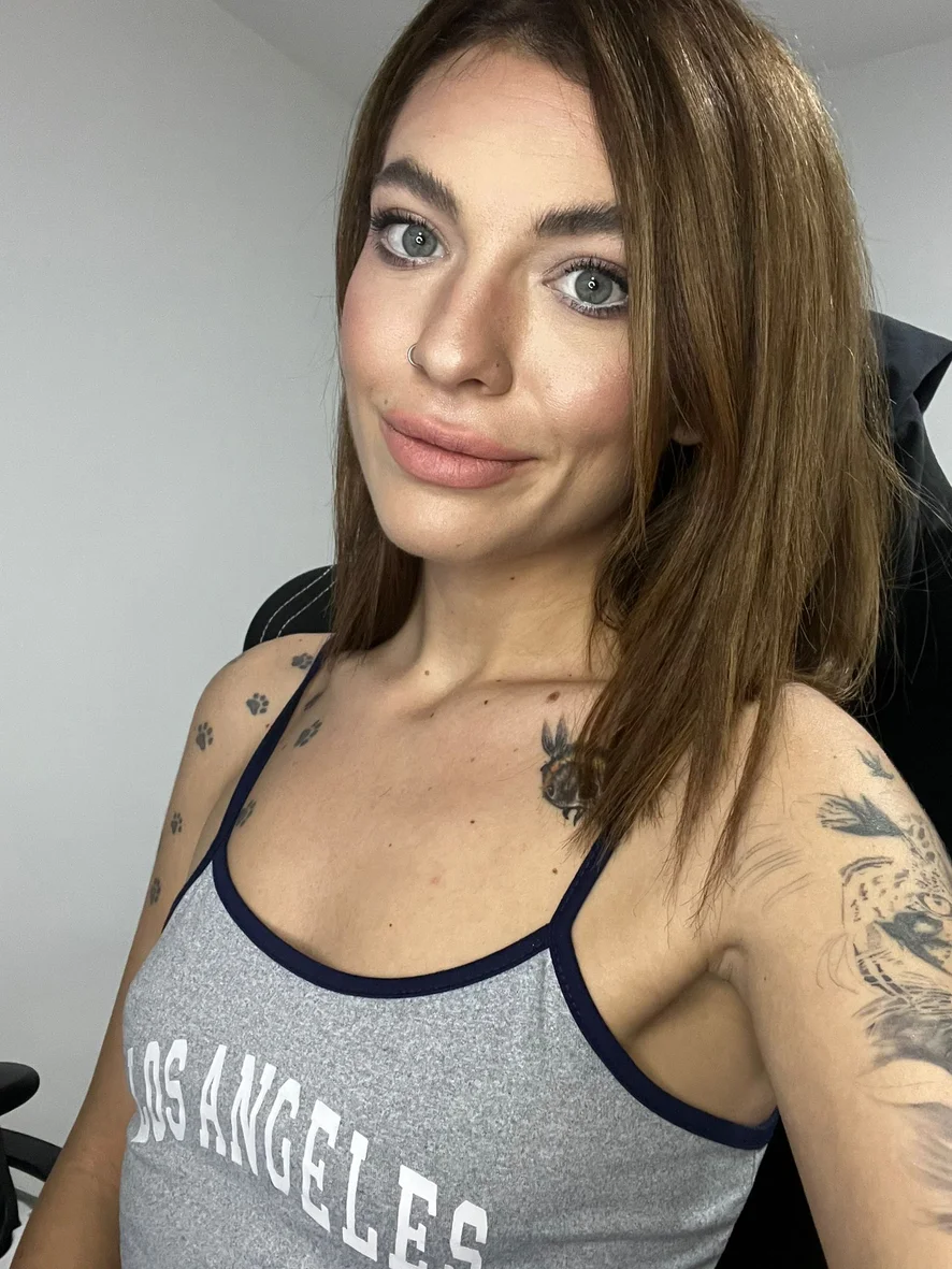 Wearing soft pink lingerie, showing off my tattoos and playful personality.